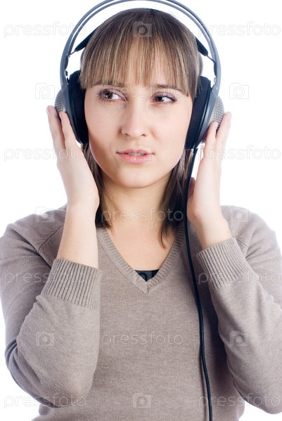 Молодая женщина с музыкальными наушниками на изолированном фоне