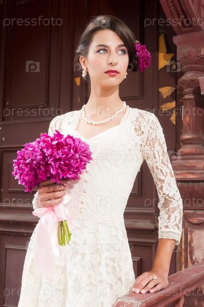 Портрет красивой брюнетки с цветами пиона на фоне старого деревянного дома