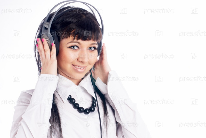 Молодая женщина в наушниках слушает громкую музыку на изолированном фоне