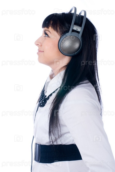 Молодая женщина с музыкальными наушниками на изолированном фоне