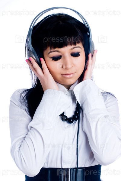 Молодая женщина с музыкальными наушниками на изолированном фоне