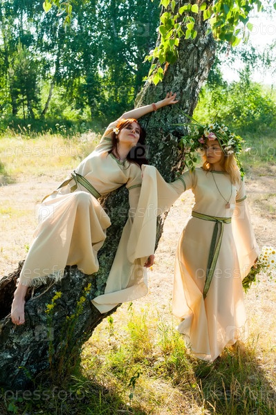 Привлекательные женщины в традиционной русской одежде расслабляются на фоне природы. Празднование Ивана Купалы