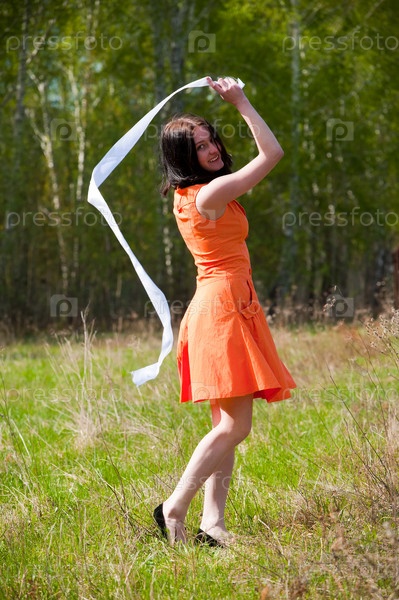 Молодая красивая женщина в оранжевом платье играет с лентой на фоне природы