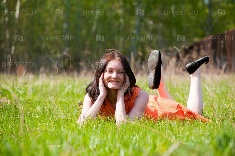 Красивая молодая женщина на открытом воздухе. Наслаждайтесь природой. Здоровая улыбающаяся девушка в зеленой траве