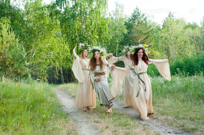 Привлекательные женщины с венком из цветов играют в ручей в лесу. Празднование Ивана Купалы