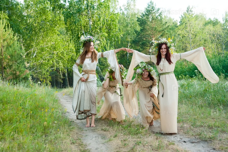 Привлекательные женщины с венком из цветов играют в ручей в лесу. Празднование Ивана Купалы