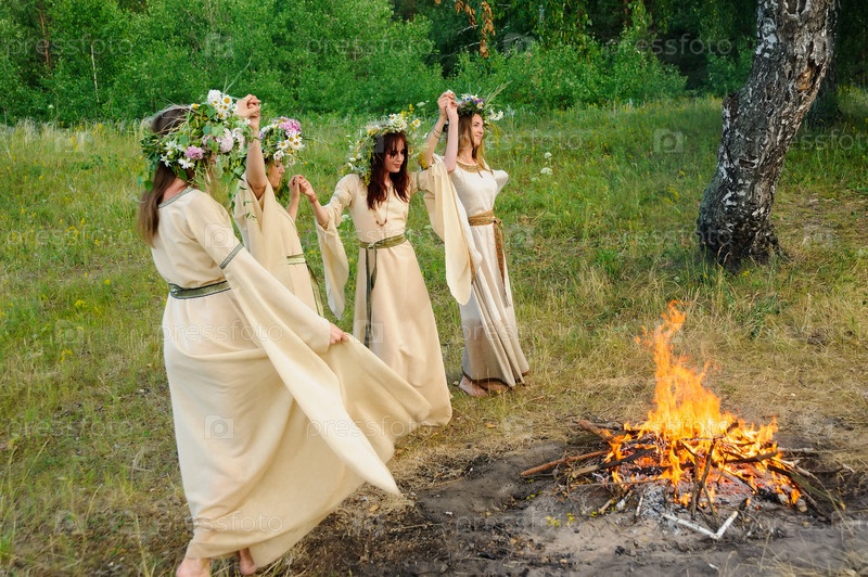 Четыре привлекательные женщины с венком из цветов танцуют вокруг костра. Празднование Ивана Купалы. Россия