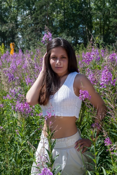 Красивая женщина в белой одежде отдыхает с букетом цветов на кипрейном лугу