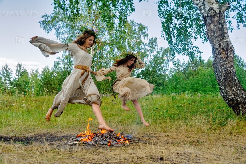 Две красивые женщины с венком из цветов прыгают через костер. Празднование Ивана Купалы. Россия