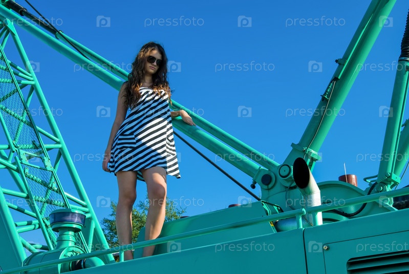 Молодая красивая женщина стоит на большом строительном кране у реки