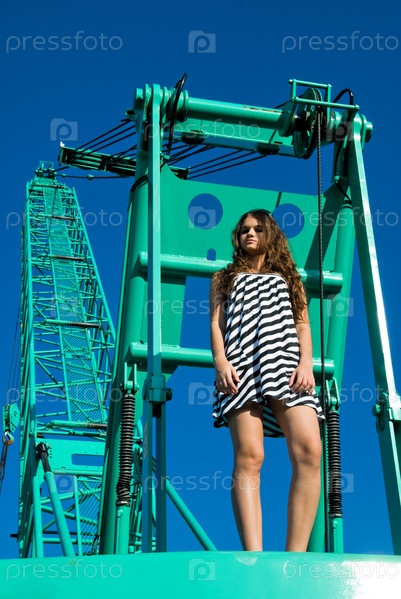 Привлекательная крутая девушка на строительном кране