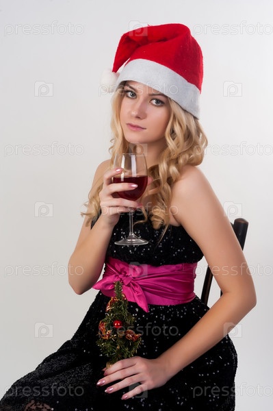Молодая красивая снежная женщина держит елку и пьет красное вино на белом фоне