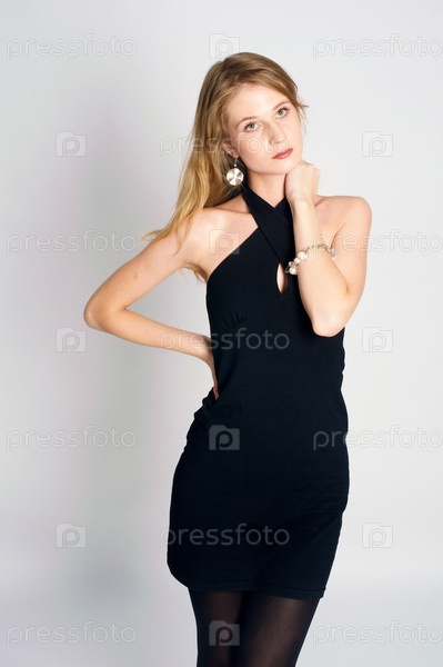 Портрет красивой чувственной женщины в черном платье, позирующей на белом фоне
