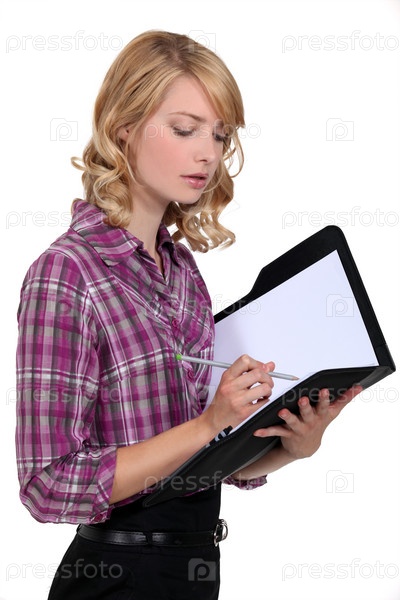 Привлекательная женщина пишет в папке