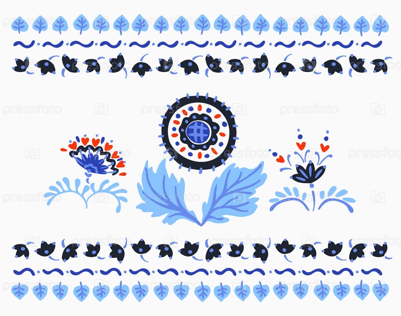 Набор этнических элементов. Бордюр представляет собой полосу с цветами, листьями, ветками, вензелями. Народная вышивка. Славянский, украинский, русский мотив. Хохлома, матрешка, дымковская игрушка. Мексиканский, индийский, цыганский ковер. Вязаное кружево