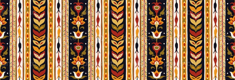 Геометрический дамасский орнамент. Икат границы. Этническая вышивка с листьями и монограммами. Племенная векторная текстура. Бесшовный народный узор в ацтекском стиле. Индийский, скандинавский, цыганский, мексиканский, африканский ковер