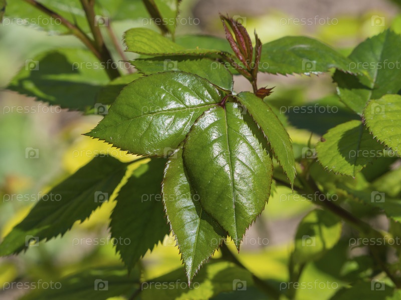 Крупный план ярко-зеленых листьев растений в солнечном свете. Молодые сочные розовые листья. листья розы