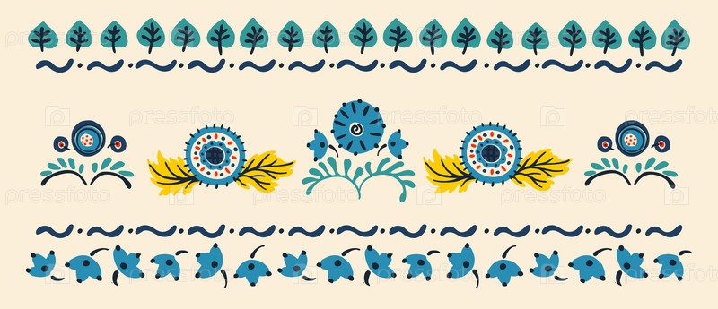 Набор этнических элементов. Бордюр представляет собой полосу с цветами, листьями, ветками, вензелями. Народная вышивка. Славянский, украинский, русский мотив. Хохлома, матрешка, дымковская игрушка. Мексиканский, индийский, цыганский ковер. Вязаное кружево