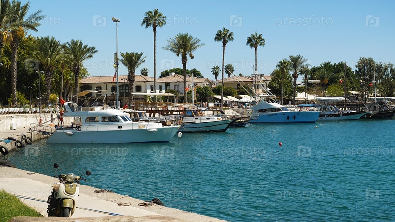 Гавань с катерами и яхтами. Кораблики мягко покачиваются на волнах. Красивый средиземноморский пейзаж с лодками и пальмами