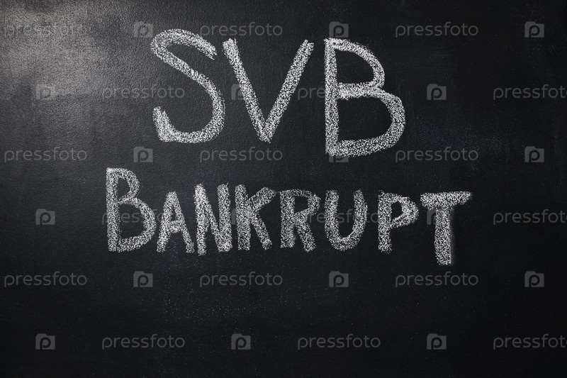 Слово SVB 'банкрот' написано белой мелкой на черной доске. Крупный план. Место для вставки текста. Банкротство американского банка Silicon Valley Bank