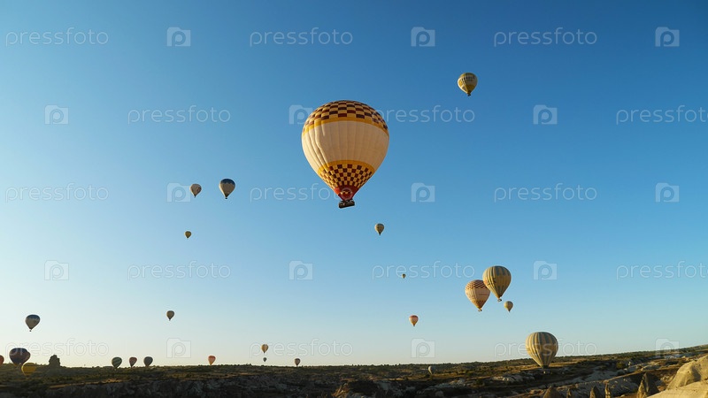Разноцветные воздушные шары летают над горным пейзажем Каппадокии, Турция. Голубое ясное небо