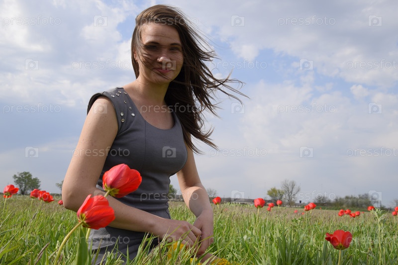 Красивая фея молодая девушка в поле среди цветов тюльпанов. Портрет девушки на фоне красных цветов и зеленого поля. Поле тюльпанов