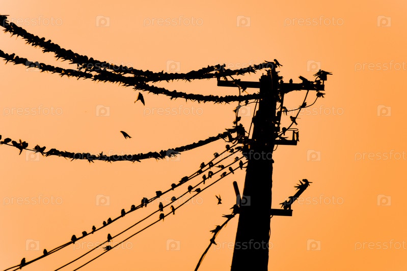Силуэты ласточек на проводах. на закате провода и ласточки