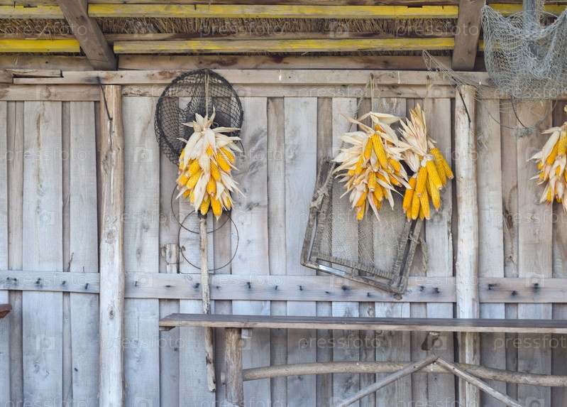 Спелые кукурузные початки сушатся на деревянной стене