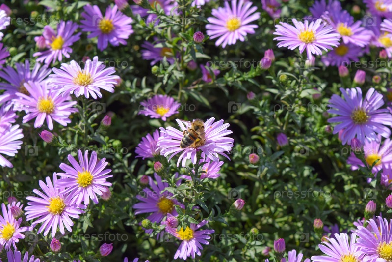 Пчела пьет нектар на светло-фиолетовых цветках