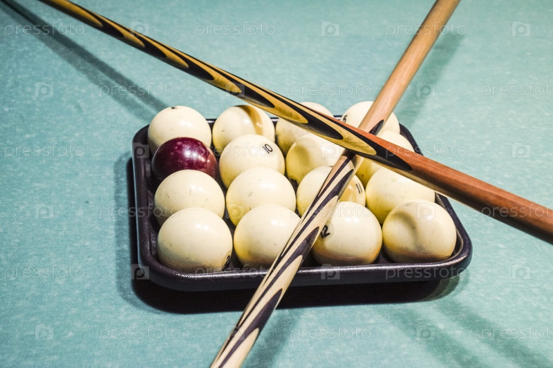 Бильярд, бильярдный стол, шары и кий. Шары в подносе и