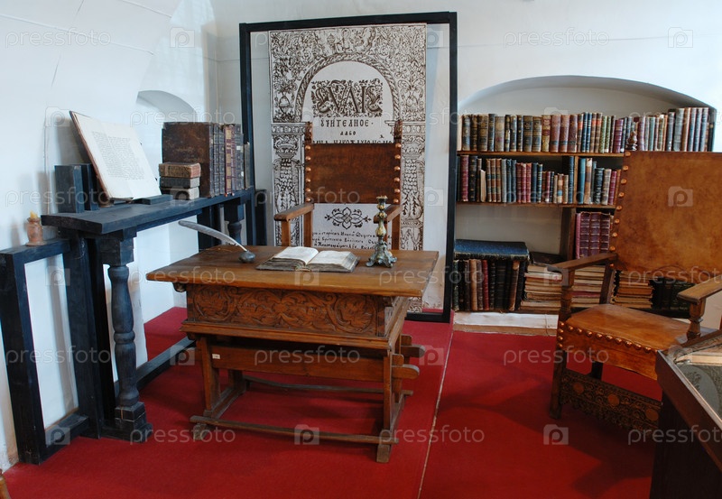 Элементы старой жизни - стол, стул, тушь, свечи, книги, книжные полки