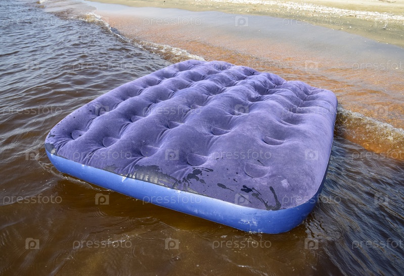 Синий надувной матрас плавает в пруду