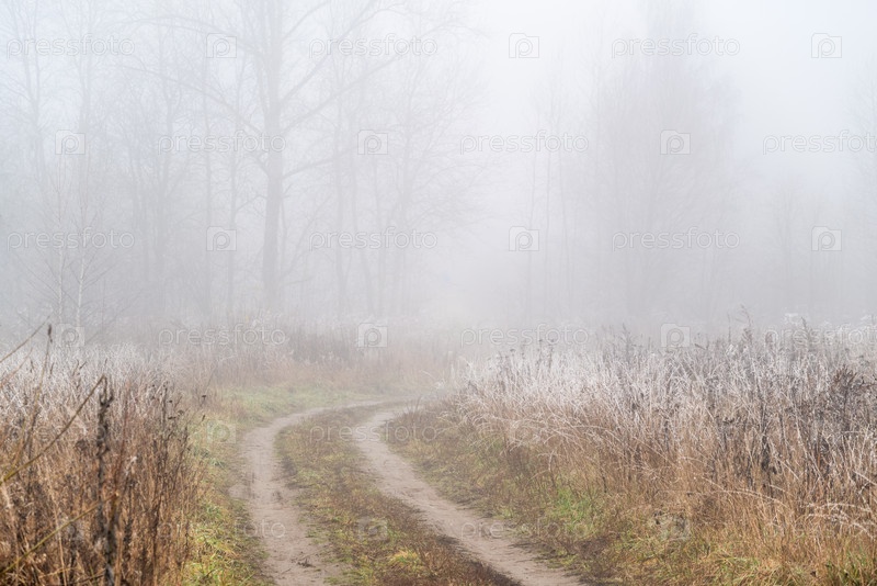 Изгиб грунтовой дороги, проходящей через поле с сухой травой, белой от мороза, силуэты голых деревьев видны на горизонте сквозь густой туман, холодный осенний утренний пейзаж
