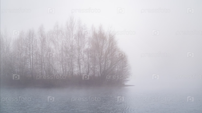 Густой туман над озером ранним утром. Силуэты голых деревьев на маленьком острове вдалеке отражаются в ряби воды
