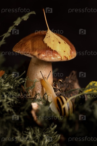 Съедобный гриб с желтым листом на крышке и милая улитка с рожками среди травы в осеннем лесу