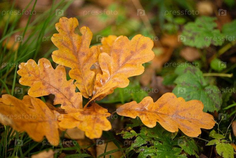 Куча пожелтевших дубовых листьев, упавших на землю, осенний сезон