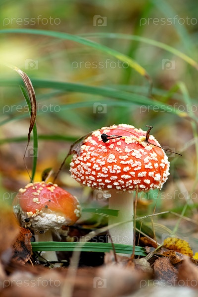 Два мухомора с красной шапкой в белых точках, растущие в траве в осеннем лесу