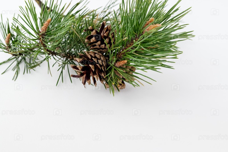 Свежая сосновая ветка с длинными зелеными иголками и шишками на белом фоне