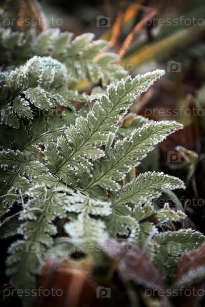 Лист папоротника, покрытый морозной каймой в зимнем лесу