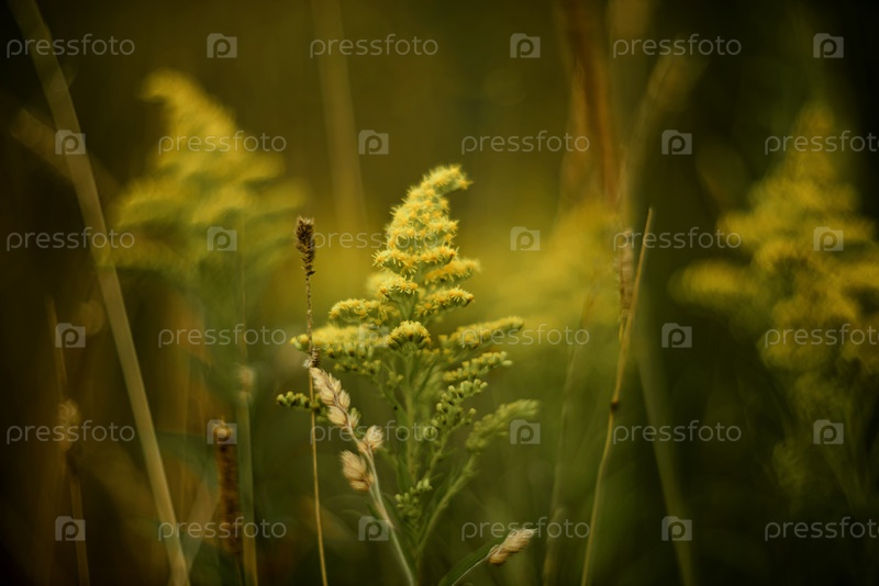 Желтые осенние цветы цветут в поле на темно-зеленом фоне размытой травы