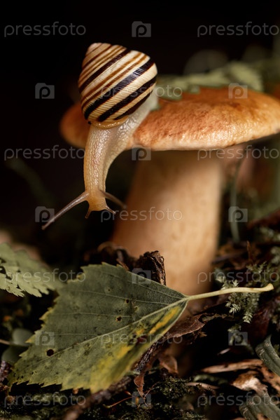 Симпатичная улитка с полосатой раковиной свисает с шапки подосиновика, растущего сквозь мох и опавшие листья в лесу