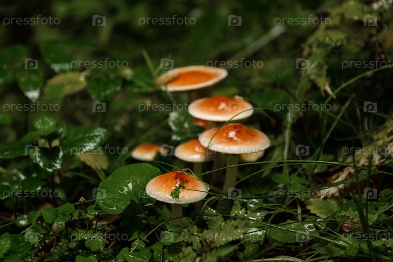 Куча грибов, растущих в траве осенью в лесу
