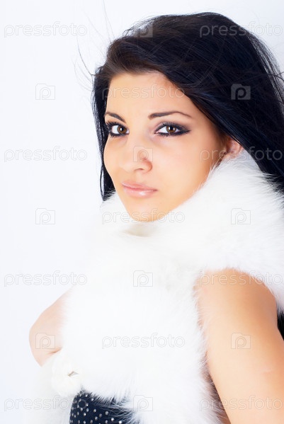 Портрет молодой привлекательной женщины в белом меху на белом фоне