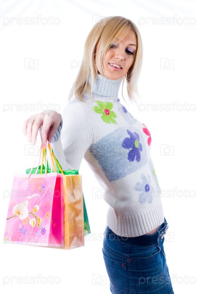 Молодая улыбающаяся женщина с сумками на белом фоне