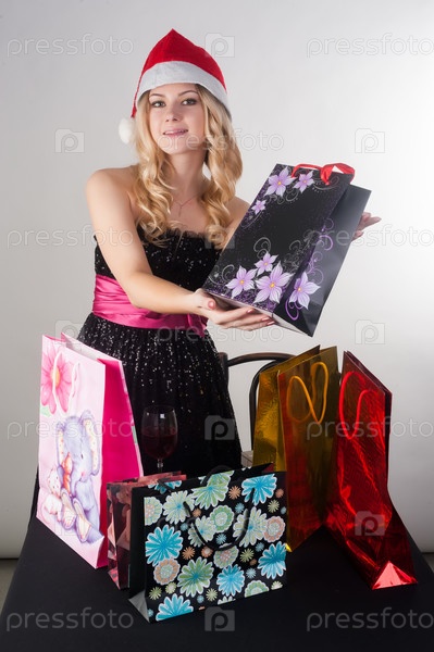 Блондинка в новогодней шапке с сумками для покупок