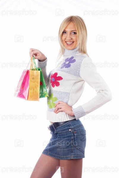 Молодая улыбающаяся женщина с сумками на белом фоне