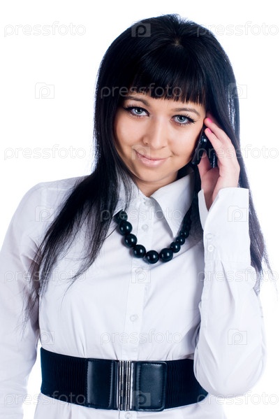 Молодая говорящая женщина по мобильному телефону над белым
