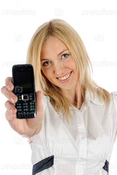 Молодая привлекательная женщина показывает свой мобильный телефон. Изолированные на белом фоне
