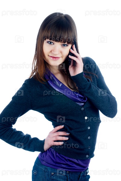 Молодая говорящая женщина по мобильному телефону над белым