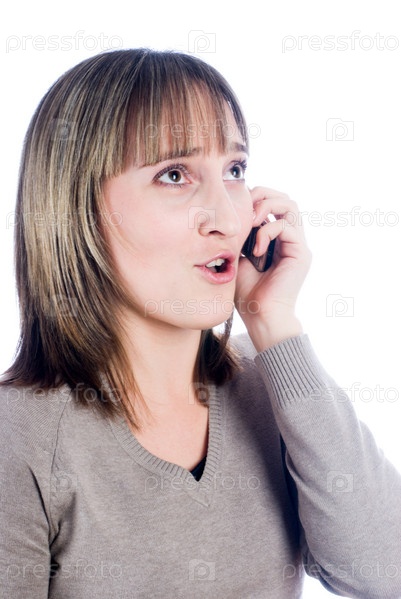 Молодая улыбающаяся женщина разговаривает по мобильному телефону на изолированном белом фоне